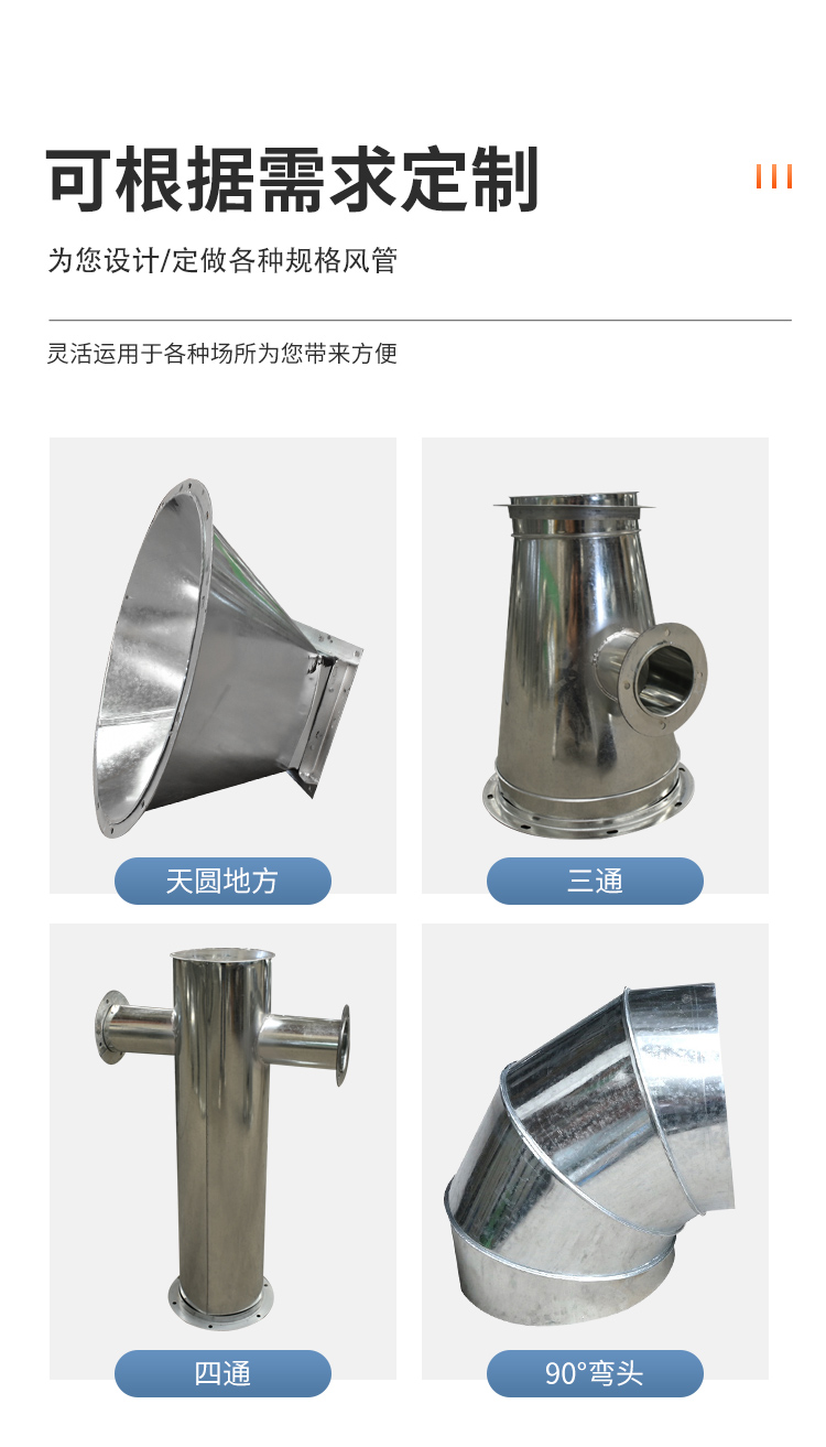 不銹鋼三通外觀光滑,無鋅瘤、毛刺,呈銀白色,設(shè)計(jì)安全美觀,我們也可根據(jù)客戶要求進(jìn)行專門的設(shè)計(jì),為客戶定做各種規(guī)格的風(fēng)管。